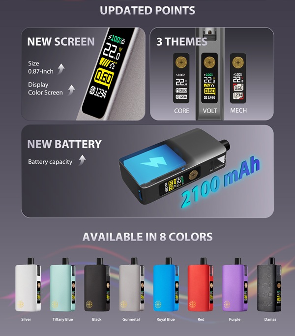 • Pod Mod: Compact, facile à utiliser, idéal pour les débutants. Les pods pré-remplis offrent une grande simplicité, tandis que les pods rechargeables permettent plus de flexibilité dans le choix des e-liquides.
