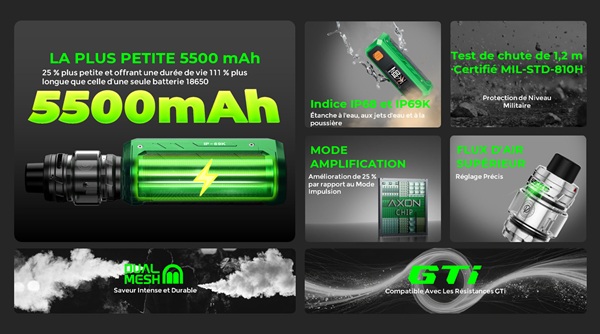 L’ARMOUR Ultra de Vaporesso révolutionne la vape avec la première batterie intégrée 5500mAh de l’industrie, offrant jusqu’à 100 W de puissance et 3 jours d’autonomie dans un format 25% plus compact que l’ARMOUR S. Certifié IP68, IP69K et MIL-STD-810H, il résiste à l’eau, la poussière, la chaleur, les chocs et les chutes. Doté du réservoir iTank T de 6ml optimisé et de la nouvelle technologie GTi Dual Mesh avec airflow élargi et mode Boost, il garantit une vape fluide, silencieuse et performante.
